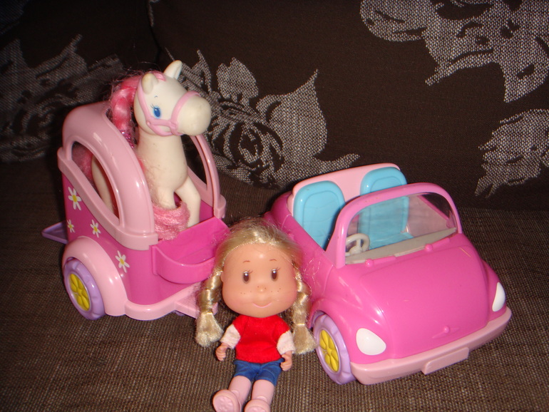 Посмотрете на официальном сайте,там вроде есть размеры или на фото посмотрите с девочкой какое соотношение игрушек по отношению к ребенку