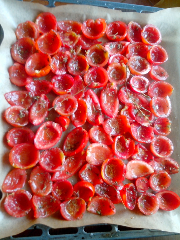 Скопились помидорки,половина пошла на кетчуп,другая часть томилась в духовке.Рецепт: соль,сахар по вкусу,несколько веточек тимьяна,розмарин,базилик,оливковое масло .при t 120-130 томились примерно 3,5-4 часа.Иногда приоткрывать дверцу,что бы уходила влага.