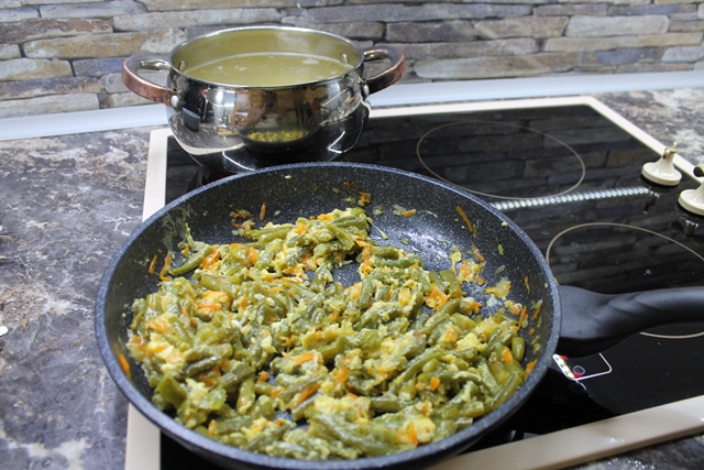 Пока бульон топится в кастрюле, нарезаю лук кубиками (1 луковица) и пассерую на сковородке, добавляю фасоль (0,5 пачки стандартной). Когда фасоль дошла до полуготовности, добавляю морковь (1 шт на тёрке). Пассирую вместе, добавляю немного воды и оставляю под крышкой. Через минут 5 взбила венчиком 2 яйца, вылила в сковородку к фасоли.