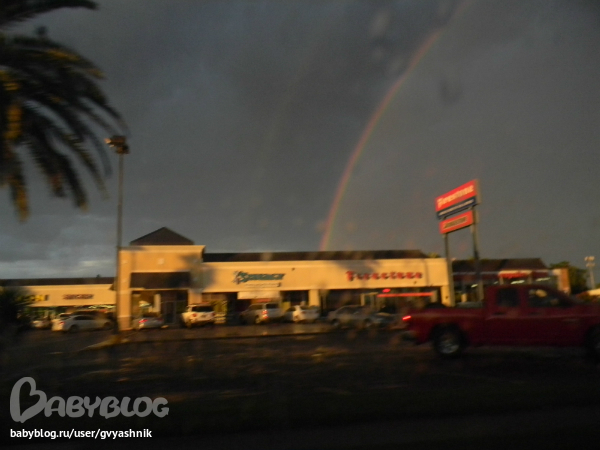 К вечеру пошел дождь. Мы решили просто покататься на машине и видели настояшее чудо. Двойную радугу! Мы даже проехали под ней. Фотографии, конечно, не передадут всей красоты этого природного явления. Но все-таки на них видно радугу!