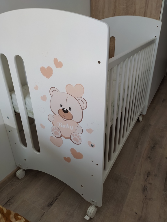 Кроватка собрана. Мы просто проверяли, вся ли фурнитура на месте, а потом решили не разбирать, раз уж собрали :) Хотя официальная версия - заранее отучить кошку не лезть в кроватку (кошка, к слову, вообще к ней никакого интереса не проявила). Ах, да! Кроватка у нас оказалась девичья, с розовым медведем на боковинке :) В магазине мы это проглядели, обнаружили дома, но возвращать не стали - сын протестовать точно не будет, а нас по функционалу все устраивает. Всё утверждают, что медведь коричневый, но, кажется, это чтобы меня успокоить :)