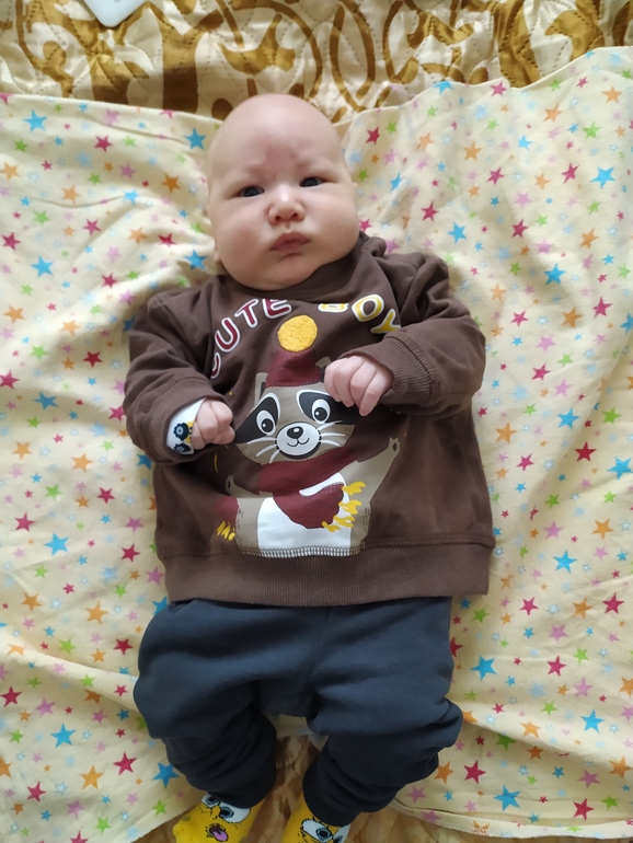 Вот и первая серьёзная дата :) Наш Мишунька растет не по дням, а по часам. Сегодня его взвесили - он теперь 5300 (+1,5 кг к весу от рождения). У педиатра ещё не были, рост не знаем, но видно, что он сильно вырос. Из роддома выписывали в костюмчике 62 размера, и рукава были как у Пьеро, а теперь 62 ему как раз. Более того, вчера примерила 68 размер, и оказалось, что и его уже можно носить 😯Вот наш мальчик в слипике 68 размера (я, конечно, фотограф ещё тот :/ Как, как другие люди делают классные фотки детей?)