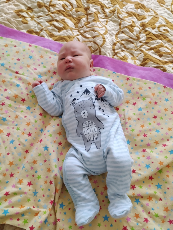 Сегодня у сына маленький юбилей. В честь первой даты мы его взвесили - он теперь 3900 (то есть примерно +100 граммов при весе от рождения). Нам с мужем кажется, что он уже подрос - в день выписки из роддома он просто тонул в слипах 62 размера, сейчас они ему чуть большеваты, но уже нормально сидят. Удивляет, что Миша пытается держать голову. Это всего пара секунд, но в роддоме я такого не замечала.