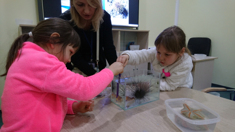 Во время презентации лектор демонстрировала ЖИВЫХ представителей иглокожих, разрешала детям играть с ними и даже держать на руках!)