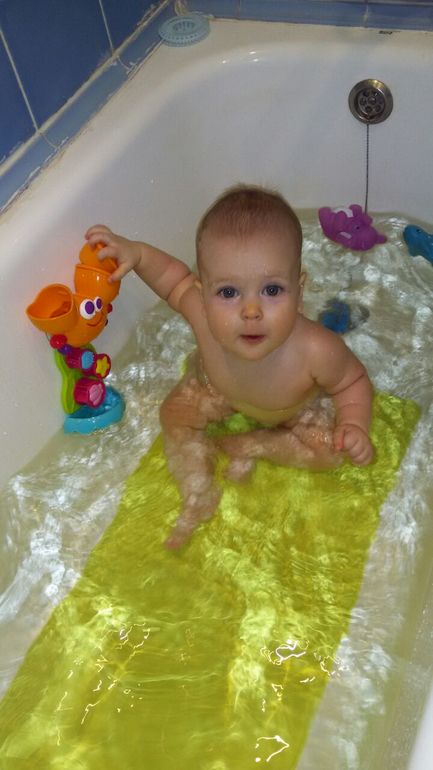 21.30 купание. Горку убрали, теперь просто на коврике сидит, играет в игрушки, переливает воду из стаканчиков, брызгается, пьет воду из ванной, играет с льющейся из крана водой. Вчера нырнула под воду, сидела, сидела, и резко наклонилась вперед и ушла на дно. Папа сразу вытащил, долго откашливалась, но не испугалась, видимо нырки в бассейне пошли на пользу.