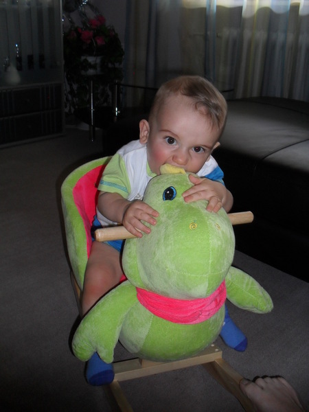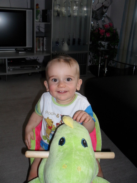 Ну вот,сегодня моему сыночке целых 9 месяцев,ещё 3 и целый Год,как же время быстро летит,кошар просто,мы уже целых 9 счастливых месяцев вместе,самый мой близкий,родной человечек!!!Что мы умеем,ну за 9 месяц научились многому,ходит около опоры,может сесть самостоятельно,когда желает поползти,на счёт звуков,не очень много он что то говорит,мамкает и то ооооочень редко,всё что то бухтит себе под нос,любит играть в ладушки,в сороку,самая любимая у нас игрушка,музыкальный барабан,который считает и говорит алфавит при ударе)))Спать стали на много хуже,чем когда либо,лезут верхние,глазные зубки,просто ужас,что мы любим кушать,страшно любит ВСЕ КАШИ,всё молочное обожает,раньше мяско любил и овощи,а теперь нафиг не надо,вегетарианец растёт,не могу запихать,из супов тоже едим не много,когда раньше ели почти всё,едим только вермешелевый,молочный,уху с консервы и всё,больше ничего не запихать,пюре любит картофельное с подливой из моркови и лука,больше там кроме зелени,чесночка ничего не должно быть,капец.прибавил очень мало,а ест,как большой,правда в этом месяце немного аппетит не такой был,как всегда,но 100 грамм за месяц.....