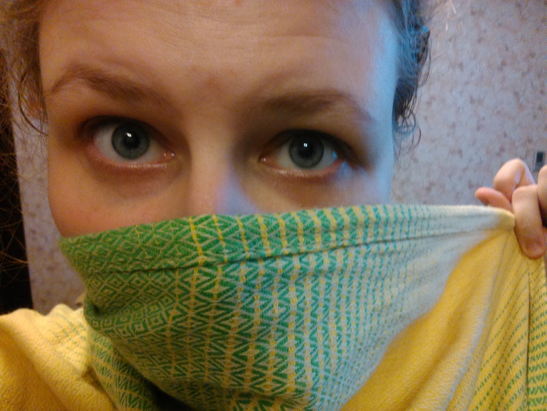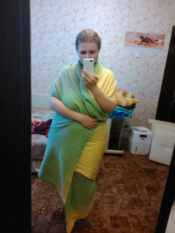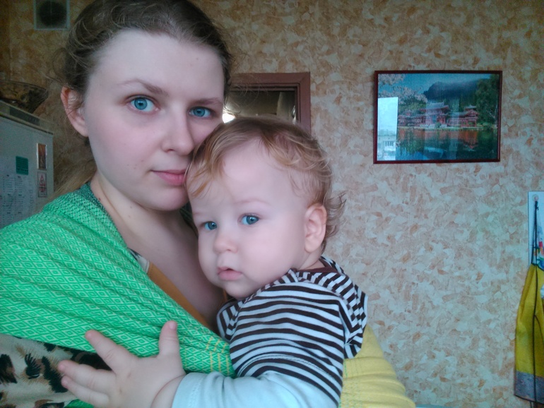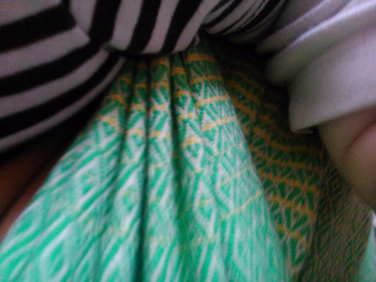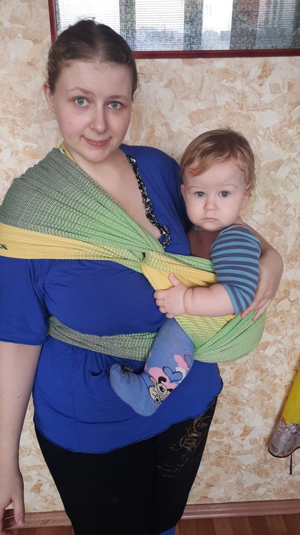 Намотка получилась прекрасной! Малыш был плотно притянут, но при этом давал дышать. Все таки тоддлера удобнее носить на бедре :)