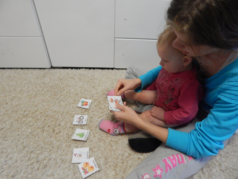 Конфеты она еще не пробовала, так что в рот не тянет. Проводили с Соней новогоднее ТЗ на английском с мультиками и песенками про новый год, теперь узнает елку, снеговика и деда мороза. Сделала ей новогоднее лото, понравилось.