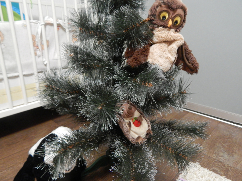 Елка у нас маленькая искусственная. Достали и на весь день отдали в распоряжение Сони, но она не сильно заинтересовалась, посадили на ветки ее игрушки и больше играть не стали. Подарки из конфет интересуют куда больше, не как лакомство, а как игрушки.