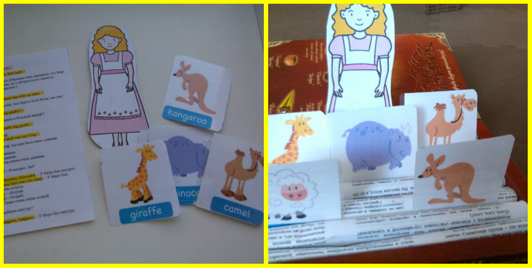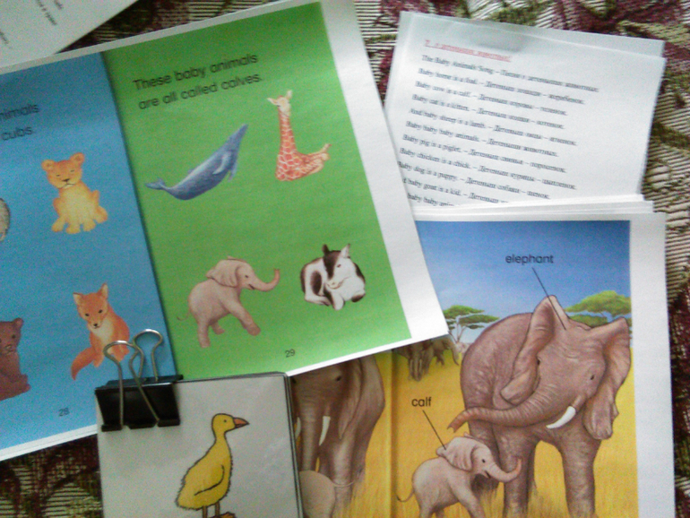 Занятия получились замечательные! Незадолго до занятий мы ходили в зоопарк и многих животных посмотрели живьем. Так что нам было интересно. Не буду описывать каждое занятие, так как все они проходили примерно одинаково. Сначала мы слушали какую-нибудь песенку, которую давно любим и танцевали под нее. Потом смотрели картинки с животными, я называла их, показывала как они прыгают или топают ( сначала я читала перевод песенки, чтобы знать о чем там будет). После картинок мы смотрели видео (иногда по нескольку раз), потом брали наши картинки и играли с ними как в мультике. К некоторым картинкам искали наших животных. Книги смотрели мало, но раньше вообще Соня не хотела смотреть. Дополнительные задания не делали, еще не умеем. Теперь все песни и видео будем включать в наши основные занятия. Пофотографировать почти не получилось. Соня бросает все, как только видит, что ее снимают и бежит смотреть.