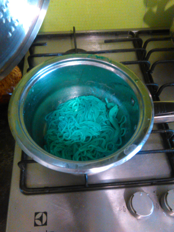 После обеда их ждали новые приколы. Лиза после школы стала переодеваться, а из одежды посыпались червяки (желатиновые), на обед ей я приготовила синие макароны (добавила краситель).