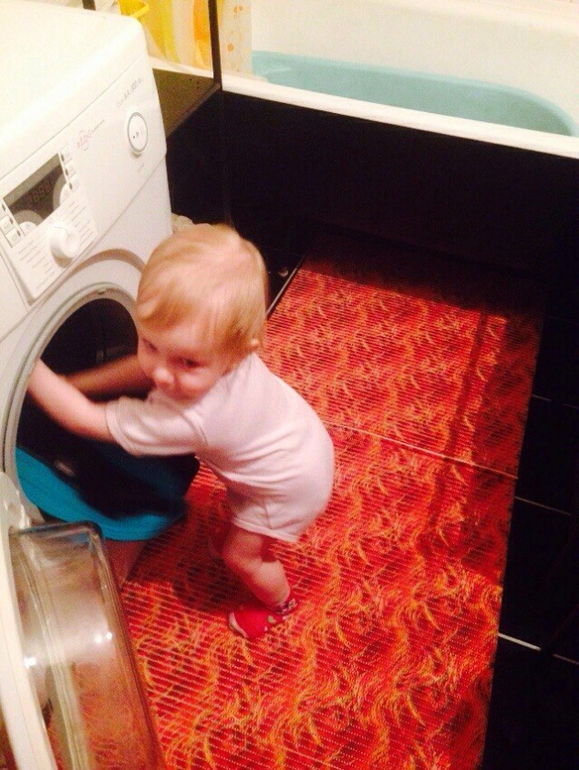 Во-первых: стирка. Сама закидывает одежду в стиральную машину, потом терпеливо ждет, пока я насыплю порошок и закрою дверцу. Обязательно сама нажимает кнопку включения. Чистую одежду из стиральной машины тоже достает она и подает мне, чтобы я повесила на веревки.