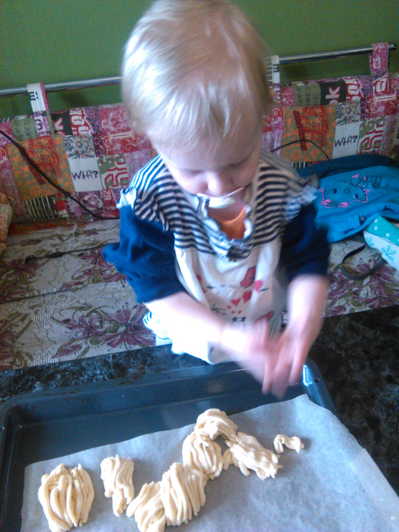 Недавно вместе делали печенье. Я крутила тесто через мясорубку, Соня отрывала кусочки и укладывала на противень.