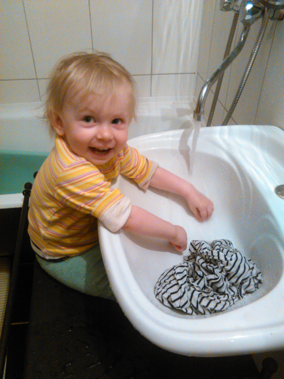 Очень любит прятки и догонялки. Обожает плюхаться в воде. У нас икеевская тумбочка под умывальником, там мне очень удобно садить Соню. Пока она «стирает», я свои дела успеваю поделать.
