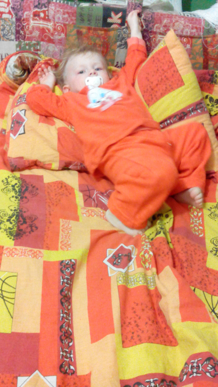 Вечером ложится только ближе к 23-00. Бабушка подарила нам классную пижамку морковного цвета, теперь по вечерам Соня превращается в МОРКОВКУ.