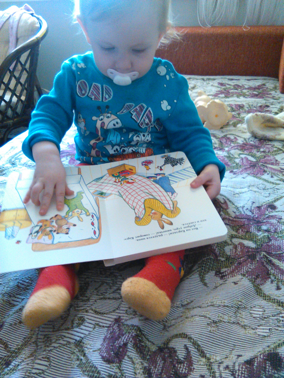 Днем мы играем, читаем, всякие тематические занятия проводим. Книги очень любит. Но не хочет, чтобы я читала, только чтобы сама рассказывала, иначе переворачивает страницы и не слушает. Любимая книга «Доброе утро, Карлхен», по нескольку раз на день приносит. Все картонные книги стоят на нижней полке, Соня сама выбирает.