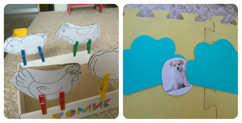 1 мая мы навещали мою бабушку в деревне и всех домашних животных увидели живьем. Через пару дней провела я с Соней занятие по домашним животным. Тема простая, материала много, постаралась не грузить ребенка, а только закрепить увиденное у бабули.