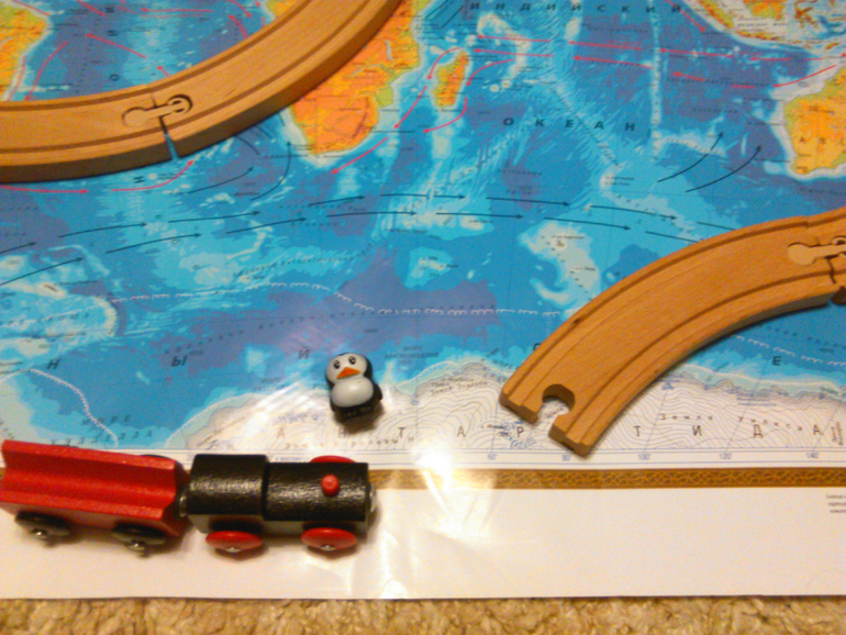 Кругосветное путешествие пингвина. Правила просты: на материках остановка, можно погулять и перекусить, на море останавливать нельзя.