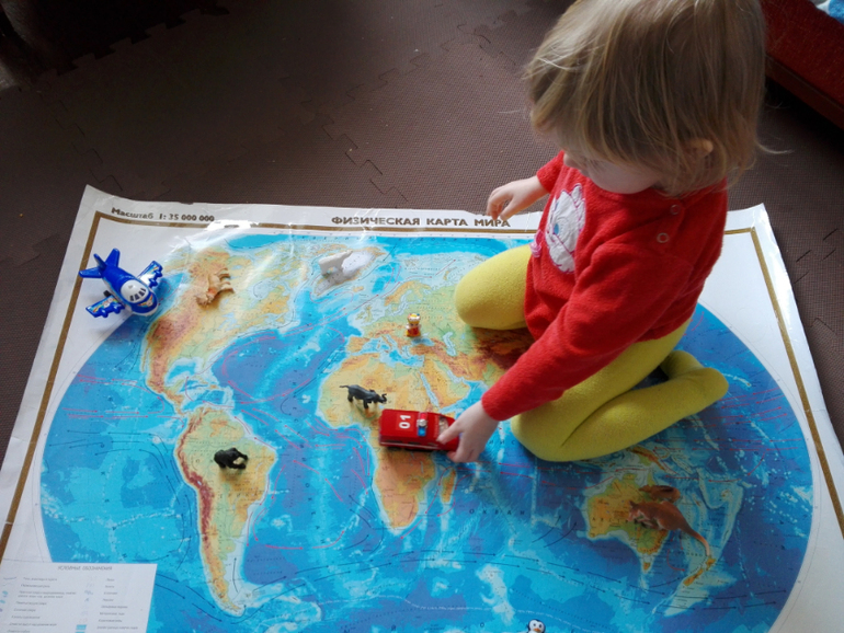 Наши занятия по географии я никогда не начинаю с самой географии. Обычно мы начинаем играть с Соней в какую-то другую игру и по ходу этой игры я предлагаю достать нашу карту и поиграть на ней. Вот так наше занятие на повторение транспорта переросло в географию.
