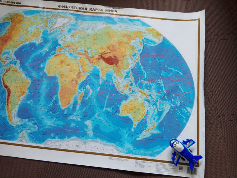 Повторив транспорт, мы стали запускать наш самолет полетать по карте. Самолет наш еле-еле ездит, что мне было на руку. Мы его запускали с края карты и смотрели до какого места он дотянет. И вот тут я напомнила Соне названия всех материков и океанов. Мы повеселились и вроде как позанимались.