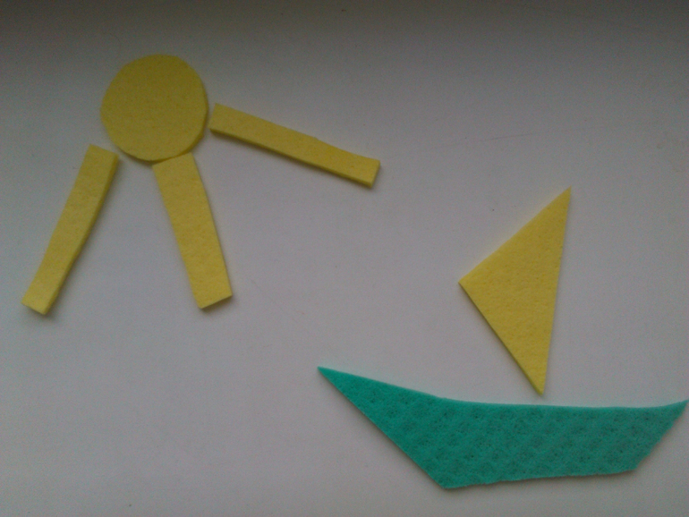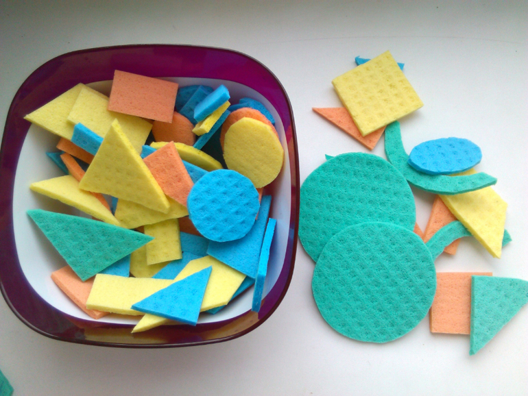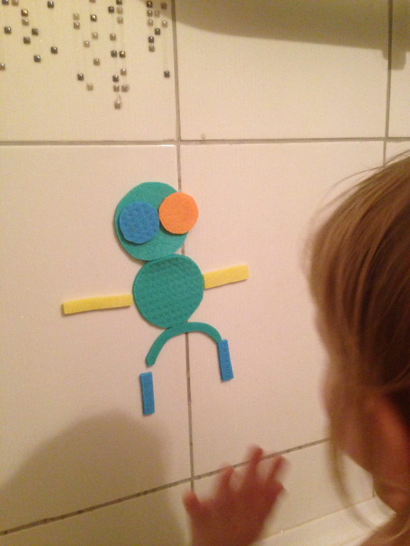 Не помню, показывала или нет вот такую игру. Это салфетки кухонные, порезанные на всякие фигуры. Мокрые они хорошо держатся на плитке. Я показала Соне, как сделать из них простые картинки, а дальше она уже сама. Вот такой человечек у нее получился абсолютно самостоятельно.