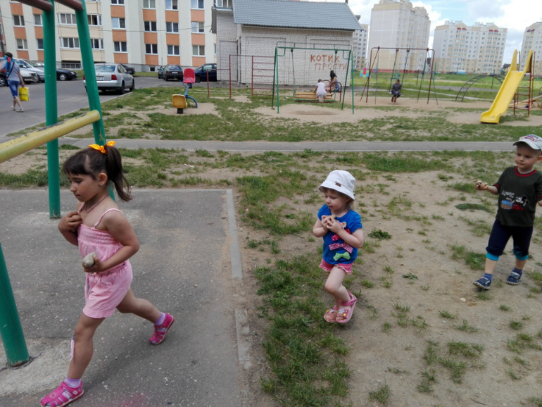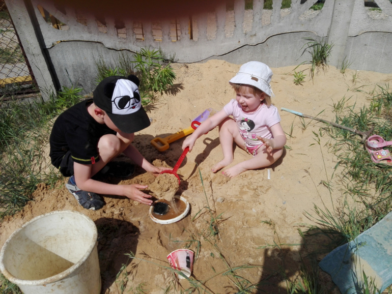 Со знакомыми детьми игры другие. Соня знает, что это свои и может совсем "разойтись". И если с площадки я могу ее просто домой увести, то тут нет. Приходиться все время быть на чеку, бесконечно объяснять, что можно, что нельзя. Зато и свободы больше. Дал им ведро с водой, пару стаканчиков и "море" готово.