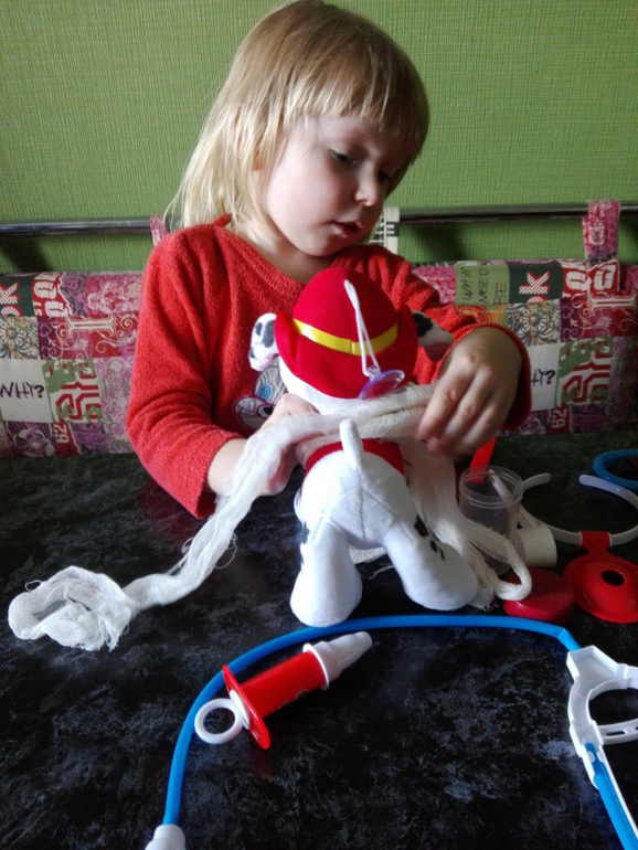 Из любимого "Щенячьего патруля" нам подарили собачку, лечит.