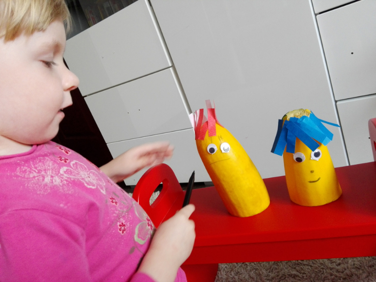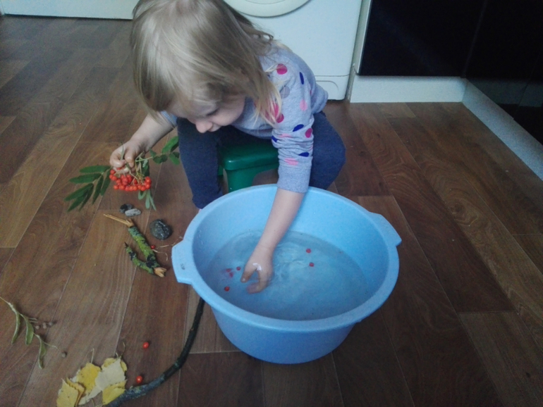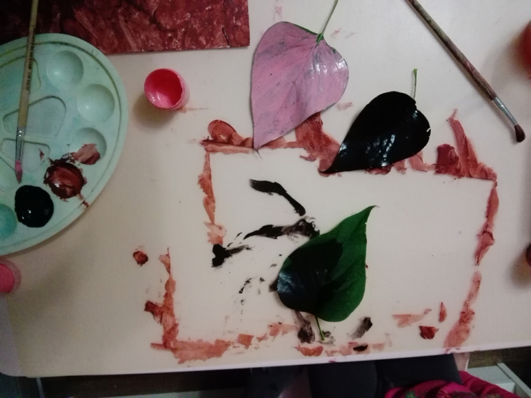 Попытка раскрасить листики. Краску Соня выбрала категорически черную. На другую никак не соглашалась, так что единственный розовый листик мой.
