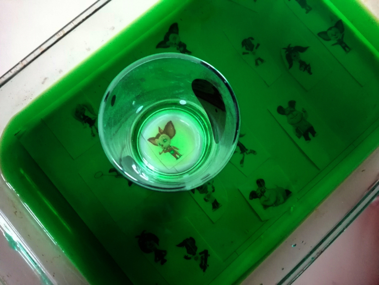 Подводная лупа. В прозрачную посуду надо налить воды, закрасить ее, положить под посуду лист с картинками, в воду опустить стакан и как через лупу рассматривать картинки. Увлекательное занятие.