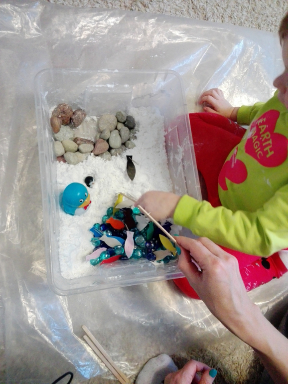 Еще мы играли в полярников. Я заморозила кучу бусин со льдом и Соня их старательно отковыривала, поливая глыбу льда теплой водичкой.