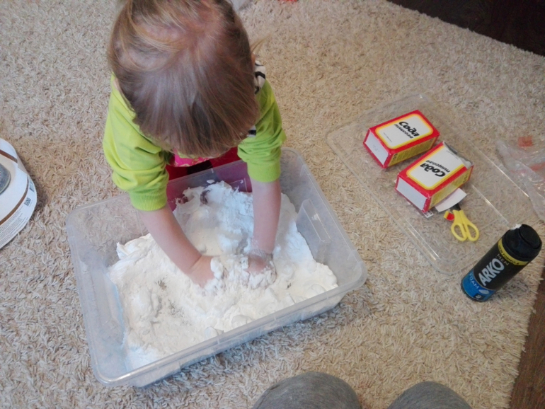 Сделали сенсорную коробку. Для снега смешали 2 пачки соды и балончик пены для бритья. Масса получилась очень приятная, игру пришлось отложить пока Соня вдоволь не наигралась этим "снегом".