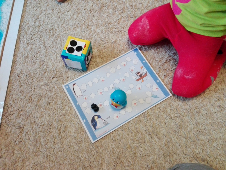 Игра-ходилка. Мама с малышом (так Соня придумала) идут к папе. Бросаем кубик, делаем столько шагов,столько на кубике кружков. Соня прекрасно справилась и даже играла по правилам, что редкость.