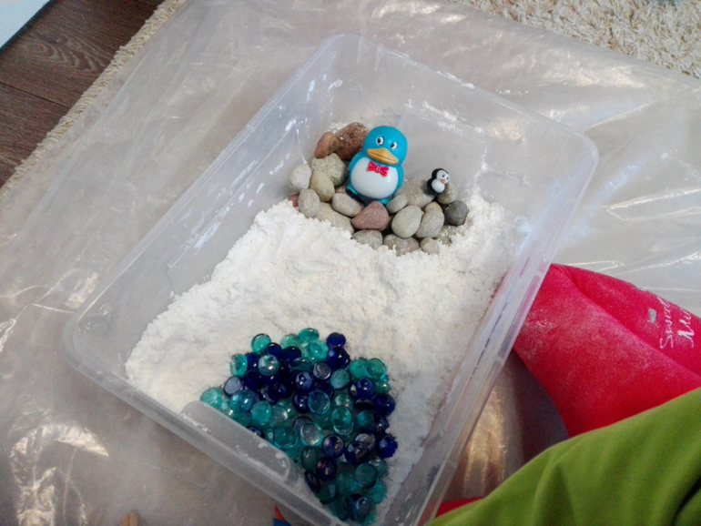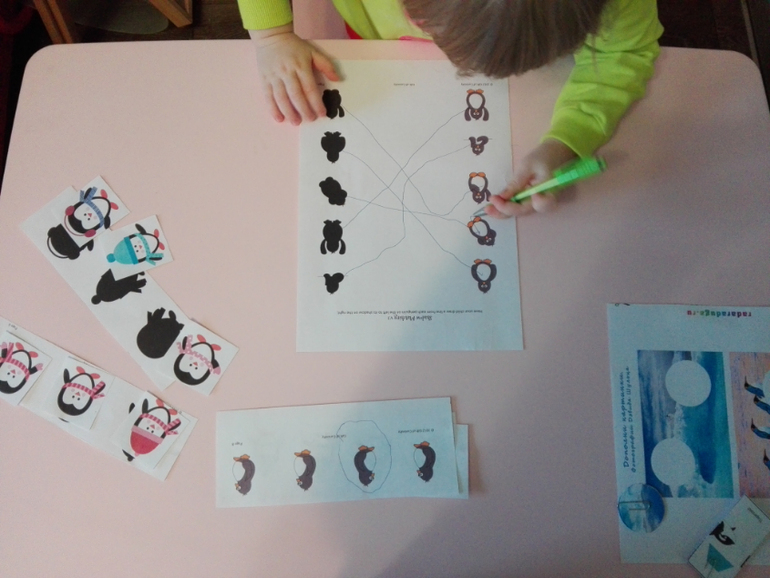Сделали фигуры альбатроса и тюленя. Я заранее вырезала заготовки из картона. Мы их раскрасили, склеили и играли в отличную игру: альбатрос воровал у тюленя рыбу, а Соня помогала ее найти. Я подсказывала немного: пойди влево-вправо, сделай шаг назад и т.д. Ребенку необходимо выслушать информацию и в точности ее выполнить, я особенно нажимала на ориентацию в пространстве.