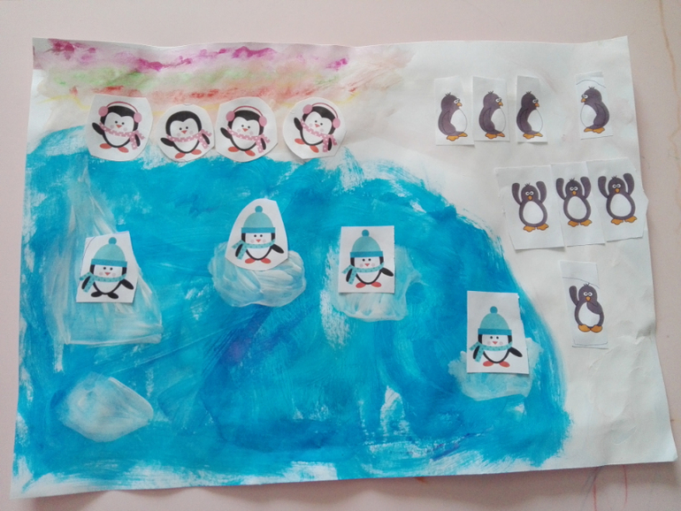 Творчество: девочки-пингвинчики смотрят на берегу, как пингвины-мальчки катаются на льдинках. Остальные пингвины делаю зарядку. Фон рисовала Соня и почти все картинки вырезала сама. Это кстати очень удобно - порезать использованные бумажные задания, придумать историю и клеть эту историю. Куча полезных занятий сразу.