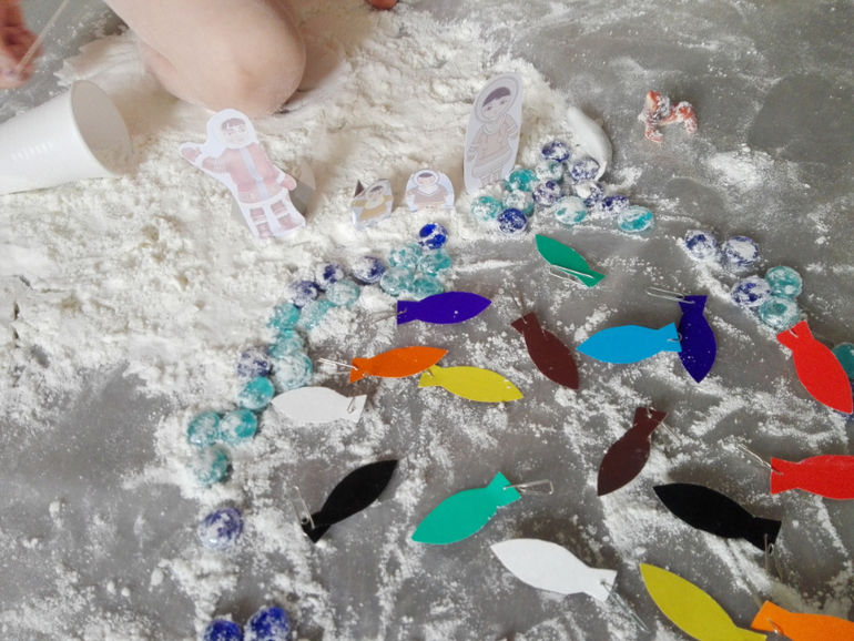 Самый известный представитель Арктики - белый медведь. С него и начали. В нашей коробке снег из соды и пены для бритья. Фигурки подходящие только две - медведь и белуха. С ними и играли.