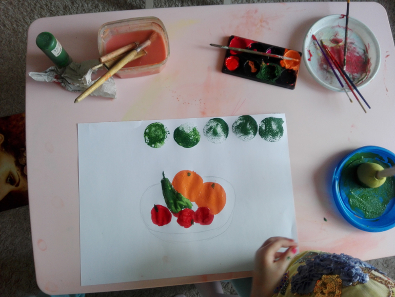 Поговорили про них, обсудили, что в них общего, сделали несколько заданий ( палитры, пазлы, заплатки). Затем стали искать то, что можно нарисовать самим. У нас нашлись парочка мандаринов, груша и редиска. Долго мы их укладывали в нужную композицию.