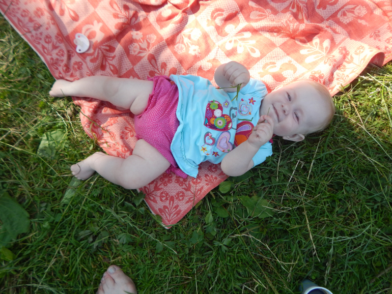 Ну, а в выходные стараемся выбраться но озеро. Лиза купается, а мы с Соней на покрывале развлекаемся. Соню очень привлекает трава и она пытается ее засунуть себе в рот. Но в основном занимается наблюдением за людьми, которых там тьма.