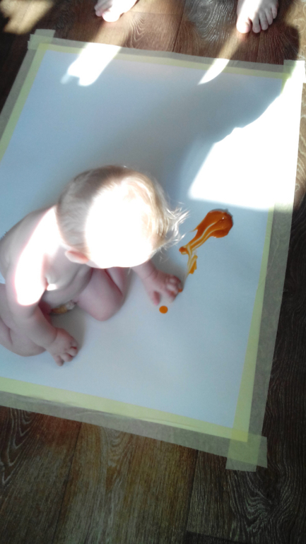 Идею о рисовании на большом листе я уже давно увидела у Лизы. Наконец- то и до осуществления дошло, правда не в таком масштабе. Для первого раза я взяла один лист ватмана, положила на пол и закрепила мялярным скотчем. В качестве краски использовала морковное пюре из баночки. Соне на создание «шедевра» хватило 5 минут. Она сразу восприняла это как веселую игру. Мы не могли не смеяться, смотря, как она размазывает пюре по бумаге, а она смеялась вслед за нами. В следующий раз надо взять несколько листов, а то как- то пространства было маловато.