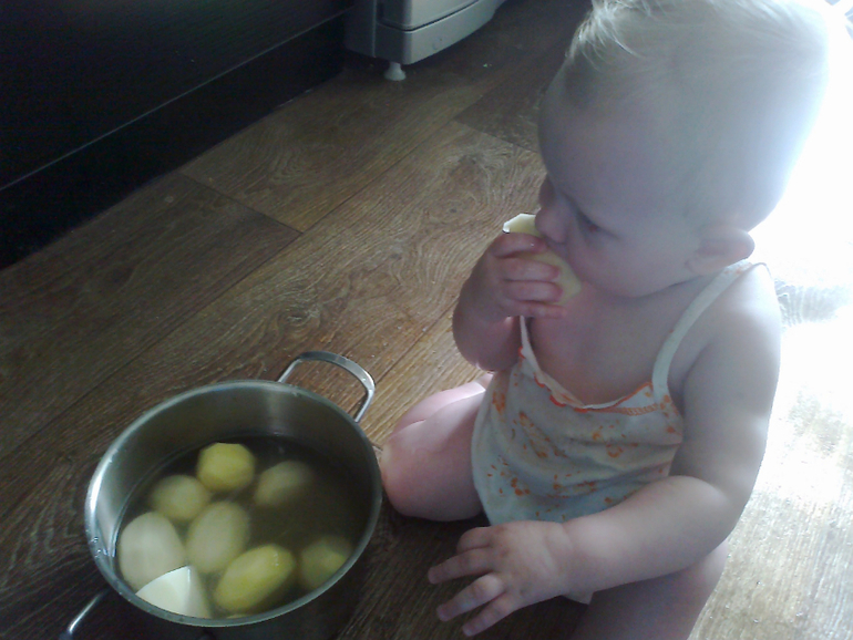 Сегодня картошку чистили с Соней вместе. В другой день я, наверное, не разрешила бы ей так издеваться над несчастным овощем. Но сегодня Соне плохо, какой-то зуб режется, с утра повышенная температура и вялость, даже врача вызвала на всякий случай. В общем до обеда все было не в радость, а эта картошка первое, что ее развеселило . Соня отрывалась по- полной: и погрызла, и раскидала по полу, и воду всю разлила. Кто-то классно наигрался, кто-то поубирался.