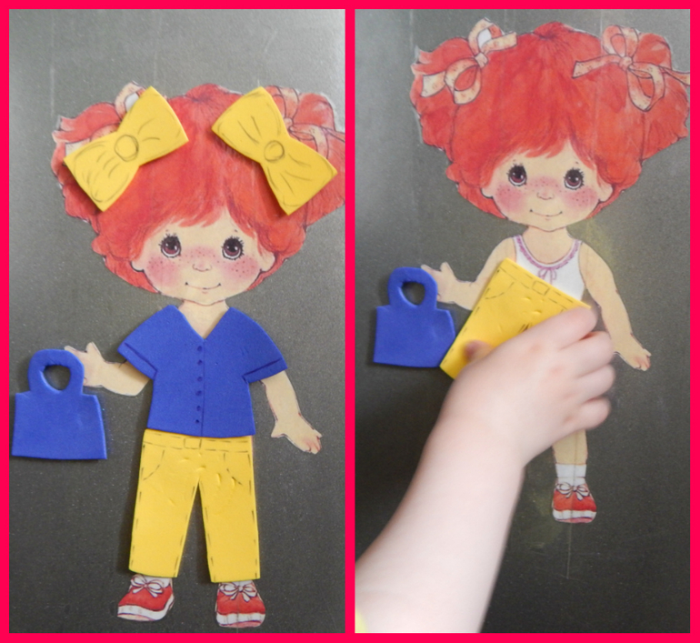 Для нашей тематической недели "Одежда-обувь" я сделала Соне такую куклу. Идея не моя, только исполнение. Вырезала бумажную куклу, приклеила скотчем на холодильник. Потом вырезала ей небольшой гардероб одежды, сначала на бумаге, потом из пенки. На одежду приклеила магнит. Все. Пока Соня играет, я готовлю или убираю. Очень удобно.
