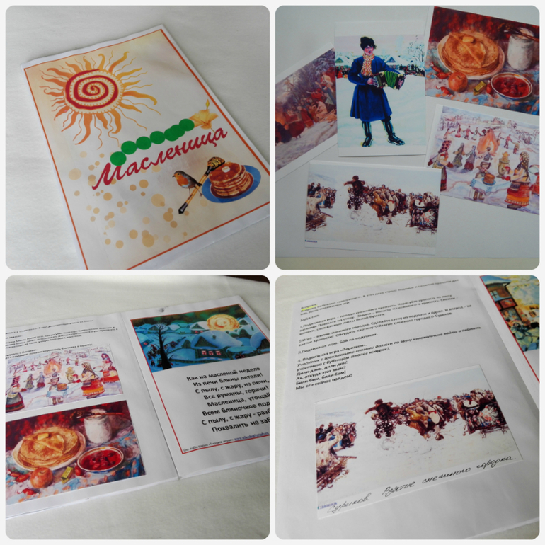 Как рассказать малышке про Масленицу? Вот такая мне пришла в голову идея: книжка про Масленицу. Пересмотрела я все комплекты с тематическими занятиями, которые скачала уже давно, взяла из каждого по чуть-чуть и добавила немного текста от себя. Получилась книга с простым рассказом о празднике, со сказкой про блинчик, с заданиями и с репродукциями картин. Вот она: