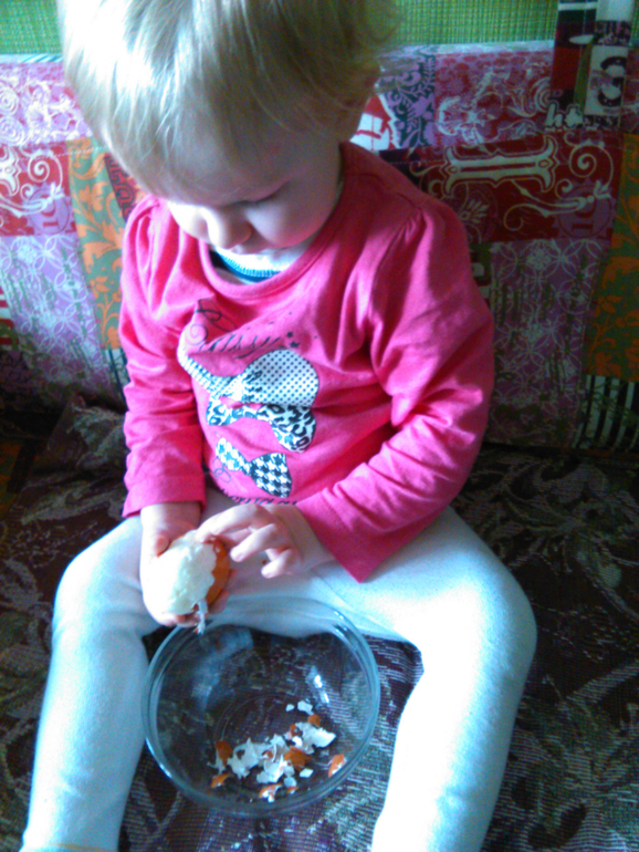 Утро началось с чистки яиц для завтрака. Специально для Сони крестная спекла малюсенькие булочки и украсила разноцветными бусинками. Вот эти бусинки Соня и послизывала., а булки не тронула. К обеду поехали в гости к родителям, отметили. И весь день смотрели телевизор, разговаривали, в общем бездельничали.