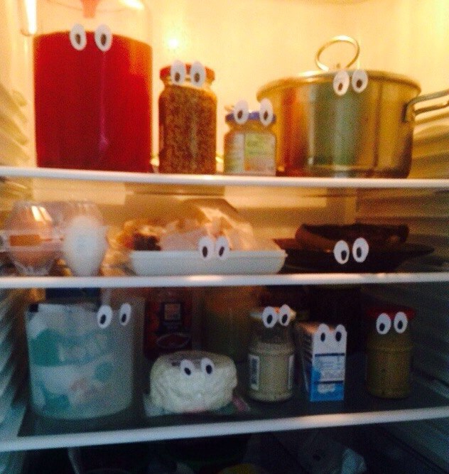 Сделать классный розыгрыш фантазии не хватило, так что просто посмешила своих мелкими приколами. Утро началось вот так( это в холодильнике):