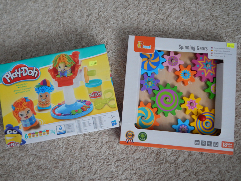 Магическая надпись СКИДКА 30% и вот я уже обладатель двух не запланированных покупок для Сони! Цена, конечно, получилась очень приятная. Плей-до хотела давно, а шестеренки вижу впервые, даже на ББ не встречала. Они замечательные: деревянные, надо покрутить самую нижнюю и крутятся все, постукивают об друг друга так здорово, шестеренки снимаются, их можно менять местами, получается другое сочетание цветов, чтобы не перепутать куда ставятся большие, а куда маленькие, на доске обрисованы их контуры.