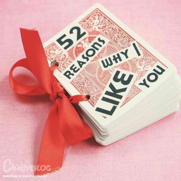Есть два варианта, Карты - прокалываешь дыроколом, надписи и фотки, а карты на ленточку. Или баночка, там уже сколько хочешь причин, листочки закручиваешь, а баночку украшаешь =)