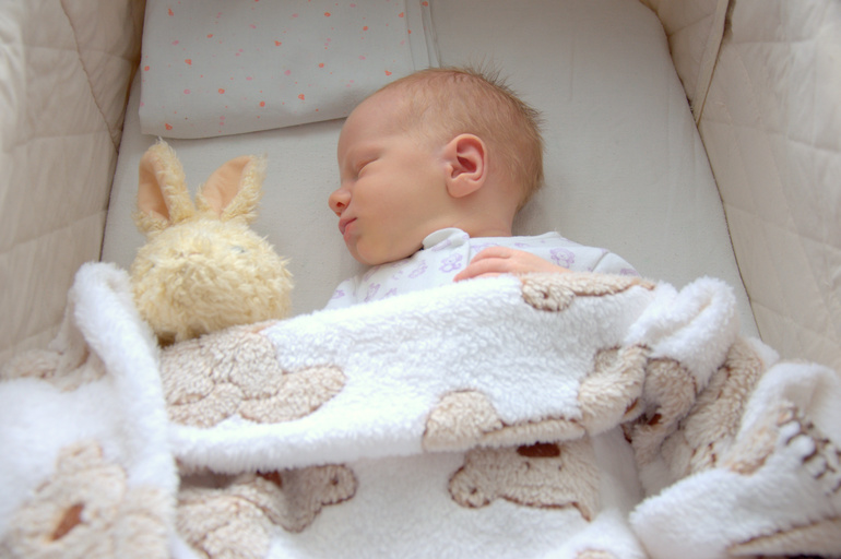 Спит Миня у себя в люльке днем, ночью чаще со мной, покряхтывая у меня под боком.