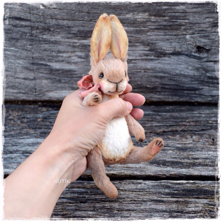 16 см стоя (с ушами), ножки-ручки-голова подвижные, в попе гранулят для усидчивости, если договориться- будет стоять, но не охотно. Глазки стеклянные.