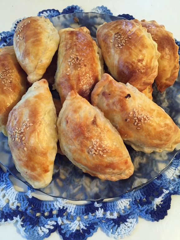 Слоенная,замесить мягкое тесто на тёплой воде с солью,оставим на пол часа.начинка может быть любой,у меня картошка +лук+жирный бараний фарш,ну и соль через.перец и зира.отдохнувшее тесто раскатать в тонкий круг смазать растопленным маргарином можно слив маслом.свернуть в рулет и в морозилку.если постоит ночь то вообще прекрасно.если к спеху то можно начинать как масло прихватится.нарезаем рулет на брусочки и формируем.