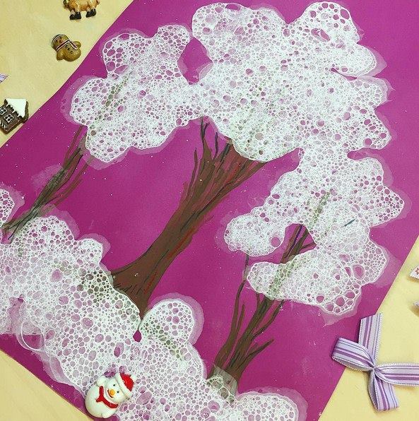 Этот заснеженный пейзаж нарисован мыльной белой пеной. Просто взбиваете смесь из фэйри, воды и белой гуаши при помощи пластиковой трубочки, как бы выдувая пену. Затем перемешиваете и выкладываете чайной ложечкой на рисунок. Через какое-то время краска засохнет, и получится вот такой шедевр.