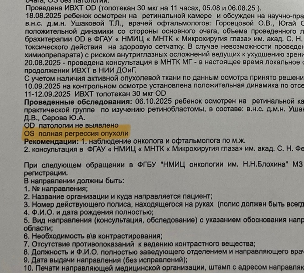 9 октября в Блохина пишут: «Полная регрессия опухоли». Правда, левого глаза, а он у Юры здоров, но, на радостях, простим им эту опечатку. Что я понимаю под полной регрессией? Исчезновение опухоли. Вот даже ИИ со мной согласен: «Полная регрессия опухоли — это полное исчезновение опухолевого образования (первичного узла или метастазов) без остаточных патологических изменений, подтверждённое клиническими, инструментальными и лабораторными методами диагностики». Чудо ведь? Мы радуемся выздоровлению, счастливо мчимся домой!